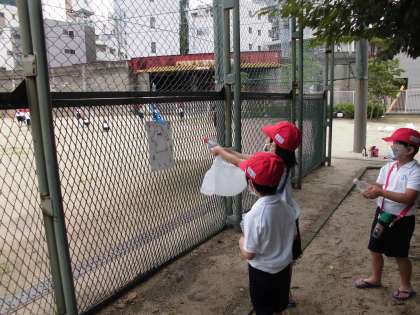 1学期もあとわずかとなりました。今日は1年生が、水遊びを楽しみました。