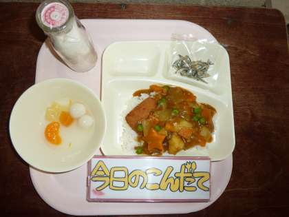 4月10日(金)は入学祝い献立で「カツカレーライス・フルーツ白玉・ミニフィッシュ・牛乳」でした。