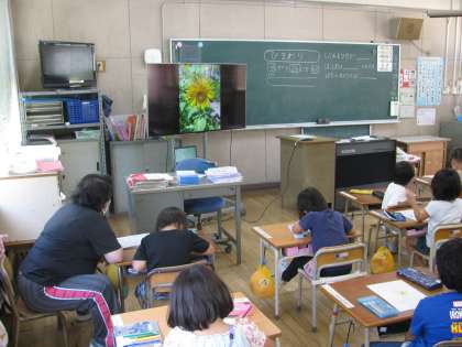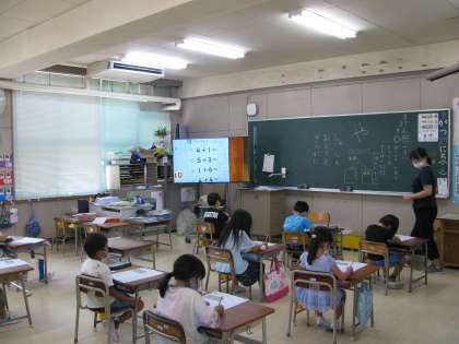 今日の1年生の学習の様子です。学習園にひまわりを見に行って絵日記をかいたり、算数のテストをしたりしていました。二学期も楽しくがんばっていきましょう!