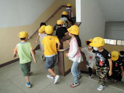 今日は、地震と地震によって津波が発生する想定で避難訓練を行いました。みんな「お(おさない)・は(はしらない)・し(しゃべらない)・も(もどらない)」をしっかりと守り、真剣に訓練をしました。災害は、いつどこで起こるかわかりません。この機会におうちでも、どこに避難するのか、何を用意しておけばいいのかなど、ぜひ話し合ってみてください。