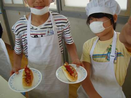 グループの友達と協力して、おいしいホットドッグが出来上がりました。