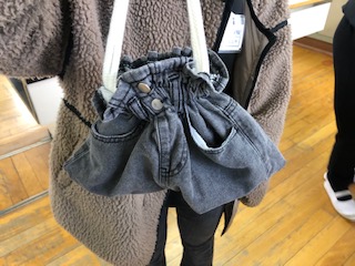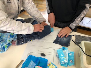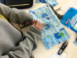 6年生が家庭科室で裁縫の実習をしていました。小さくなった服や家庭で使わない布などをリメイクしています。巾着ぶくろやブックカバーなど、世界に一つだけの作品を楽しんで作っています。
