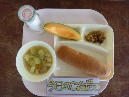 6月2日(火)の献立は、「カレードリア・キャベツのスープ・クインシーメロン・ライ麦パン・牛乳」でした。子どもたちに人気のドリアは暑い時期でも食べやすいようカレー味に仕上げました。それにキャベツがたっぷり入った野菜のスープに、給食では年一回登場するクインシーメロンが1/8切れ付きました。