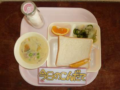 6月9日(火)の献立は「かぼちゃのクリームシチュー・ミックス海そうのサラダ・オレンジ・食パン・はちみつ・牛乳」でした。子どもに人気のクリームシチューにはこれからが旬となるかぼちゃ(産地は鹿児島県と長崎県)が入り、今回はバターを使用したホワイトルウで風味のあるシチューに仕上げました。残食も少なく好評でした。それにミネラルたっぷりの海そうを使ったサラダに、オレンジがつきました。