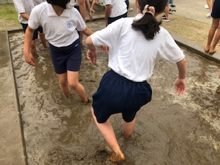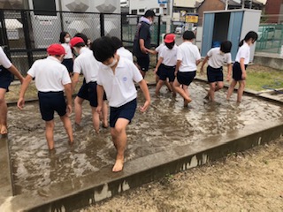 5年生が田植えに向けて、水田づくりを進めています。今日は、はだしで田んぼに入り、土を柔らかくしました。やわらかい土と水の感触にいろいろな声があがっていました。