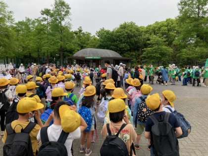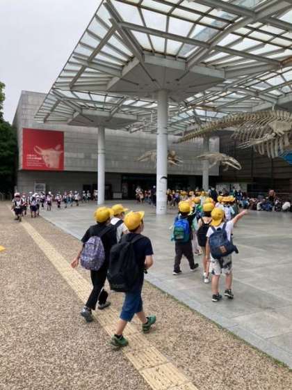 自然史博物館に来ました。みんなの大好きなナガスケにも会えます。 入り口では、岸里和楽会の地域のみなさんにもお会いしました。