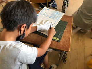 2年生の教室では、カッターナイフの練習をしていました。軍手を使い安全に気を付けながら、切りこみをしていきます。そろりそろり・・・。