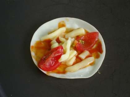 トマトやなすびを小さく切って、ソースをかけた餃子の皮に載せました。