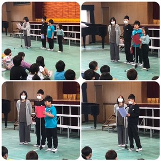 作文発表は、1年生と5年生でした。一年間の思い出やがんばってきたこと、そして新しい学年でがんばりたいことなど、しっかりと発表できました。新しい学年になること、新1年生の入学を楽しみにしていること、チャレンジしたいことなどがよくわかりました。