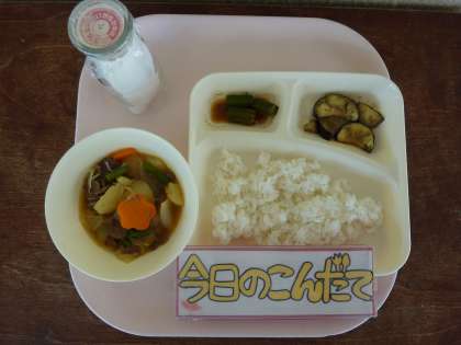 9月2日(水)の献立は「肉じゃが・焼きなすのみそだれかけ・オクラのおかかいため・ごはん・牛乳」でした。子どもに好評の肉じゃがに、秋が旬のなすを焼いて甘めのみそだれをかけたものと、夏が旬のオクラをかつおぶしといためたおかかいためが出ました。