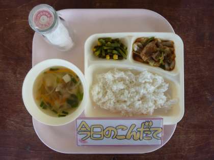 9月7日(月)の献立は「ホイコウロー・とうふのスープ・三度豆とコーンの甘酢あえ・ごはん・牛乳」でした。ホイコウローは主材の豚ばら肉を下ゆでし脂ぬきして柔らかくした後、野菜と一緒にいため、テンメンジャンなどの調味料で味つけました。ごはんのすすむ一品に仕上がりました。それに、チキンスープを使用した野菜たっぷりのとうふのスープに、色あいもきれいな三度豆とコーンの甘酢あえがつきました。
