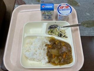 今日の給食は、大好きな子どもたちも多いカレーライスでした。大鍋でしっかりと煮込んであり、とってもおいしいです。感想をお家で聞いてみてください。