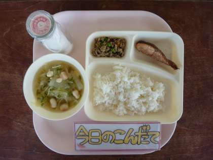 9月9日(水)の献立は「さけのてり焼き・五目汁・高野どうふのいり煮・ごはん・牛乳」でした。料理酒、みりん、こい口しょうゆで下味をつけて焼いたさけはごはんのすすむ一品でした。それに今月が最後の使用となる夏野菜のとうがんが入った具だくさんの五目汁に豚挽肉とだし汁のうま味をたっぷりしみこませた高野どうふのいり煮が出ました。