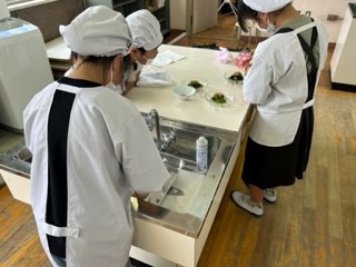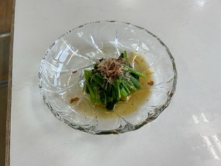 「ほうれんそうのお浸し」です。用具の使い方などにも気を付け、楽しく実習ができました。ほうれんそうの彩も鮮やかで、とてもおいしそうです。