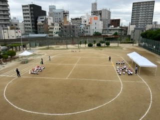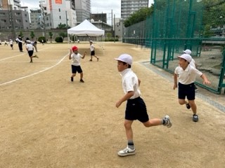 鬼ごっこでウォーミングアップ。とはいえ、逃げるほうも追いかけるほうも、とても真剣。すごい体力と走力です。そのあとは、運動会個人走の走り方を学習していました。