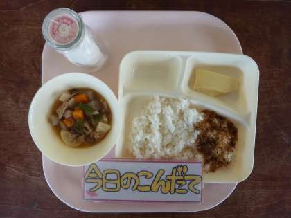 10月1日(木)の献立は「卵どうふ・豚肉と野菜の煮もの・おかかなっ葉・ごはん・牛乳」でした。卵どうふは、けずりぶしでとっただしに、みりん、塩、うす口しょうゆで味つけし、液卵をまぜ1クラスの人数分をミニバットに入れて焼き物機で蒸して作りました。それを教室でクラスの人数に分けて配缶しました。それに豚肉とさといもやれんこんなどが入った煮ものとかつおぶし、だいこん葉、いりごまを炒め、みりん、こい口しょうゆで味つけして作ったおかかなっ葉がつきました。手作りのふりかけはごはんのすすむ一品でした。