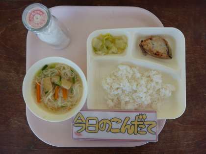 10月2日(金)の献立は「かつおのガーリック風味焼き・にゅうめん・はくさいの甘酢づけ・ごはん・牛乳」でした。かつおのガーリック風味焼きは卵アレルギーのある子どもも食べられるように卵を使用していないノンエッグドレッシングを使用し、かつおにからめて焼きました。それにうすあげ、たまねぎ、にんじん、青ねぎの入ったにゅうめんと、はくさいの甘酢づけがつきました。