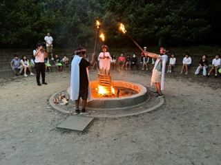 キャンプファイヤーがスタートしました。火を司るキシーノ族の点火により火が灯りました。