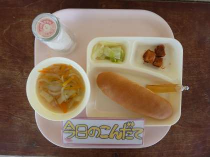 10月13日(火)の献立は「まぐろのオーロラ煮・スープ・サワーキャベツ・コッペパン・はちみつ・牛乳」でした。まぐろのオーロラ煮はしょうが汁で下味をつけたまぐろにでんぷんをまぶして油であげ、ケチャップ、砂糖、赤みそで作ったたれをからませて作りました。子どもに人気のある献立でした。スープはベーコンでうま味を出し、じゃがいも、たまねぎ、にんじん、青みにパセリを加えて仕上げました。それにオリーブ油を使用したドレッシングであえたサワーキャベツがつきました。