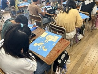 5年生の教室では、版画にする板を彫刻刀を使ってほっていました。一人ひとりの個性あふれる作品が楽しみです。