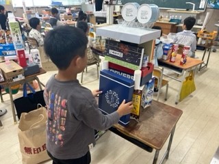 1年生の教室です。お家から持ってきたいろいろな箱を組み合わせています。何ができるかな?作品展に向けて、1年生の作品も楽しみです。