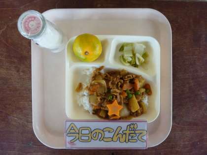 10月22日(木)の献立は「ポークカレーライス[米粉]・はくさいのピクルス・みかん・牛乳」でした。今月は食物アレルギー対応サポート月間です。今日のポークカレーライスに使用するカレールウの素は原材料に小麦粉を使用していない米粉のカレールウなので小麦アレルギーのある子どもも食べることができました。それに旬のはくさいのピクルスと旬のみかんがでました。米粉のカレーライスもおいしく食べてもらえてました。