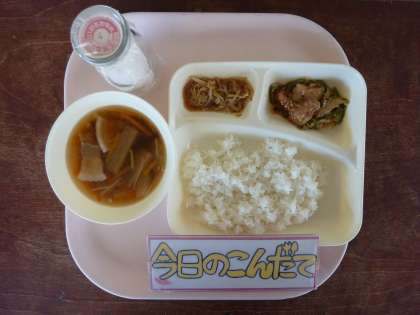 10月27日(火)の献立は「鶏肉のごまだれ焼き・ソーキ汁・もやしのしょうが風味あえ・ごはん・牛乳」でした。鶏肉のごまだれ焼きは、鶏肉にたまねぎ、ピーマンを加えて練りごまの入った調味料で下味をつけ、いりごまをふって焼き物機で焼きました。ごまの風味が香ばしい一品でした。それに沖縄の郷土料理であるソーキ汁ともやしのしょうが風味あえがでました。ソーキ汁のソーキとは、豚のあばら肉のことで給食ではだいこん、白ねぎなどの野菜と切りこんぶを一緒に煮込んで作りました。豚ばら肉はいったんゆがいて余分な脂を落とし柔らかく煮る工夫をして作りました。残食のないどのクラスもしっかりと食べてくれた給食でした。