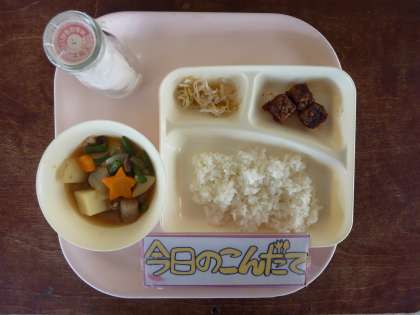 11月2日(月)の献立は「くじらのオーロラ煮・じゃがいもと野菜の煮もの・もやしのゆずの香あえ・ごはん・牛乳」でした。年1回のくじらを使った献立は毎年好評で、今年はオーロラ煮での登場となりました。今年のくじらは、くじらの風味を味わえるように肉のカットサイズを少し厚くしてボリュームを出しました。それにじゃがいもが主材の煮ものとゆずの風味がさっぱりとおいしく仕上げたもやしのゆずの香あえがでました。