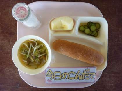 11月4日(水)の献立は「肉うどん・きゅうりの甘酢づけ・りんご・ライ麦パン・牛乳」でした。肉うどんは牛肉がたっぷり入った子どもに人気のある献立です。かまぼこ、はくさい、にんじんを煮込んだうどんだしに、香りよく炒めたしょうがに牛肉を加え砂糖、こい口しょうゆで味つけした具をうどん、青ねぎと一緒に加えて仕上げました。牛肉のうま味をしっかり味わえ、温まる一品でした。それにきゅうりの甘酢づけと1/4切れのりんごがつきました。