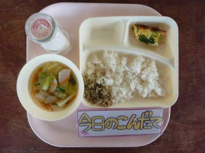 11月9日(月)の献立は「千草焼き・すまし汁・ツナっ葉いため・ごはん・牛乳」でした。千草焼きは平成24年度以来の久しぶりに登場した献立です。炒めた鶏挽肉にコーン、とうふを加えて更に炒め味つけしたものを、だしの入った鶏卵と混ぜてミニバットにいれ、焼き物機で蒸し焼きにしました。それにはくさい、さといも、だいこんと旬の野菜がたっぷり入ったすまし汁とツナとだいこん葉を料理酒、しょうゆなどの調味料で炒めて作った手作りのふりかけ「ツナっ葉いため」がつきました。ごはんのすすむ献立でした。