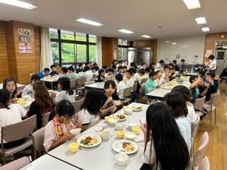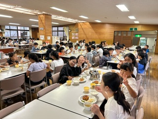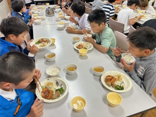 夕食の時間になりました。おなかぺこぺこです。ご飯とお吸い物は、おかわりができるので、みんな大喜びです。