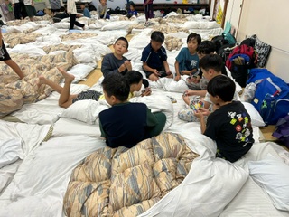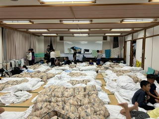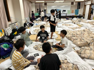 一日の疲れと汗をお風呂で流しました。敷き詰められた布団は、昔の合宿を思い出します。この後、反省会をして、消灯・就寝を迎えます。