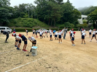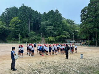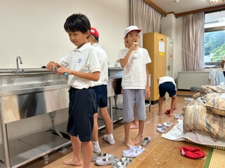 気温23度、くもり空、みんな元気です。体操で体と頭を起こしています。鳥のさえずりに囲まれたいます。