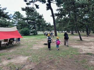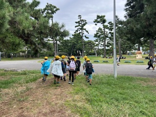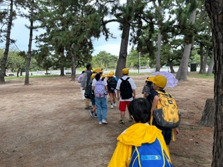 高学年児童が低学年児童を助けながら、回っています。