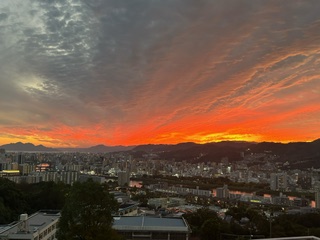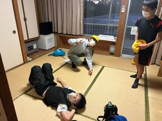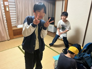 開舎式を終え、部屋に入りました。全ての部屋からとてもきれいな夕日が西の空に見えます。この後、避難訓練を行い、お楽しみの夕食・天然温泉の入浴になります。露天風呂もあります。