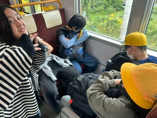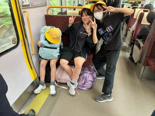 在来線での移動、つかれ気味の子どもたちです。この後、新幹線に乗り換えます。