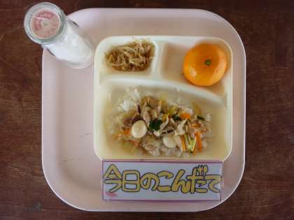 12月15日(火)の献立は「中華丼・もやしの中華あえ・みかん・牛乳」でした。豚肉、うずら卵を主材にたくさんの野菜と一緒に炒め、煮た中華丼の具をごはんを盛り付けた上にかけて食べました。もやしの中華あえはごま油とごまの香りがおいしいあえものでした。それに和歌山県有田産のみかんがつきました。