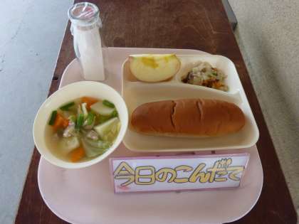 12月18日(金)の献立は「鶏肉と野菜のスープ煮・きのこのドリア・りんご・黒糖パン・牛乳」でした。鶏肉を主材にじゃがいもなどの野菜の入ったしょうゆ味のスープ煮としめじ、エリンギ、マッシュルームと三種類のきのこがたっぷりと入ったドリアに1/4切れのりんごがつきました。