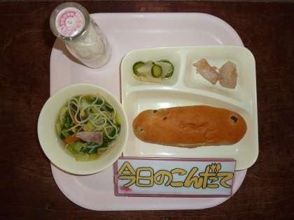 1月8日(金)の献立は「鶏肉のオイスターソース焼き・ラーメン・ピリ辛あえ・レーズンパン・牛乳」でした。焼き豚とにんじん、もやし、チンゲンサイ、コーンの野菜が入った寒い時期に体の温まるラーメンがでました。それにオイスターソース等で下味をつけ焼いた鶏肉ときゅうりとだいこんのピリ辛あえがでました。今年最初の給食、どのクラスもしかっり食べてくれていました。