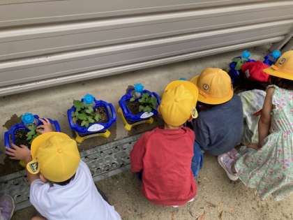 朝顔がぐんぐん育ってきています。子葉に続いて本葉が出てきました。形の違いを観察しました。ダンゴムシに夢中な子も…。