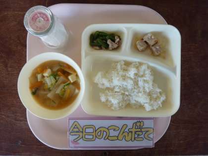 2月4日(木)の献立は「まぐろのしょうゆマヨネーズ焼き・みそ汁・三度豆のいためもの・ごはん・牛乳」でした。サイコロ状のまぐろにしょうゆとマヨネーズで下味をつけて焼いたまぐろはごはんのすすむ一品でした。それに具だくさんのみそ汁と豚肉と三度豆をうす口しょうゆと洋がらしの風味をきかせたて炒めた炒めものがでました。