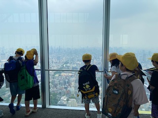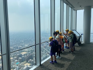 3年生が「あべのハルカス」に社会見学に行きました。高速エレベーターで45秒で60階に着くと、パノラマビューが広がっていました。
