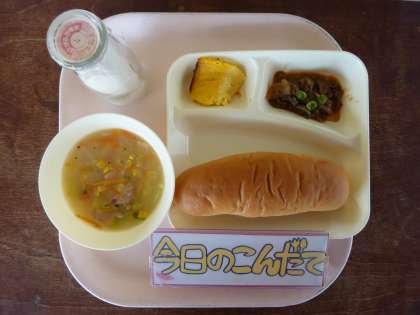 2月17日(水)の献立は「牛肉のデミグラスソース煮・コーンスープ・かぼちゃのプリン・黒糖パン・牛乳」でした。ワインで下味をつけた牛肉をたまねぎと一緒にデミグラスソース味に煮込みました。それにベーコンのうま味とコーン、スイートコーンの甘みが調和した子どもに人気のコーンスープとかぼちゃのペーストが入った色目にもきれいなかぼちゃのプリンがでました。