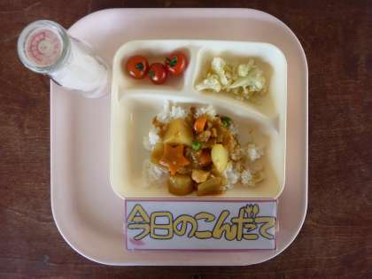 3月7日(月)の献立は「チキンカレーライス・カリフラワーのピクルス・プチトマト・牛乳」でした。カレーライスは子どもたちに人気の献立です。今回は鶏肉を使用したチキンカレーライスでした。それに冬野菜のカリフラワーとコーンのピクルスにプチトマトがつきました。