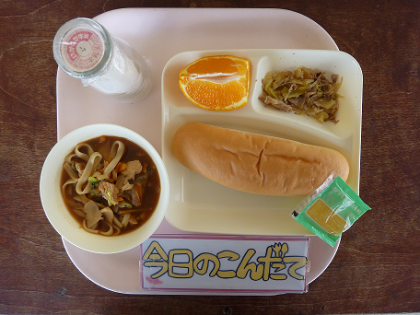 3月8日(火)の献立は「みそきしめん・豚肉と野菜のいためもの・デコポン・コッペパン・りんごジャム・牛乳」でした。名古屋を中心とする東海地方の郷土料理であるみそきしめんがでました。それに豚肉とキャベツ、もやしの野菜炒めに和歌山県産のデコポンが1/4切でました。