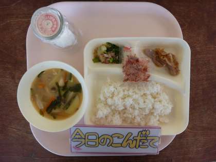 3月15日(火)の献立は「豚肉の甘辛焼き・みそ汁・菜の花のおひたし・ごはん・牛乳」でした。角切りの豚肉とたまねぎを甘辛味に焼いたものに、鶏肉も入ったみそ汁と年に1回3月に登場する菜の花を使ったおひたしがでました。菜の花は独特の苦みがあるのではくさいを加えて食べやすくしました。