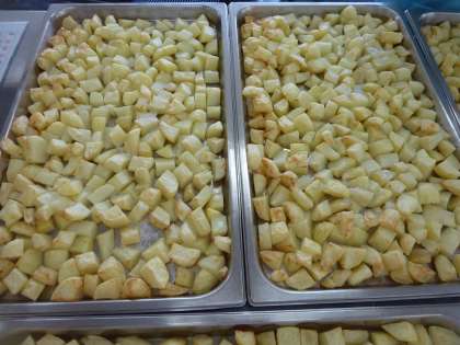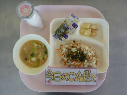 4月14日(木)の献立は「かやくご飯・みそ汁・焼きじゃが・牛乳」でした。焼きじゃがはホテルパンに角切りに切ったじゃがいもを並べて焼き物機で焼き塩をふって仕上げました。