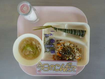 5月6日(金)の献立は「牛肉のちらしずし・すまし汁(ふ)・ちまき・牛乳」でした。今日の献立はこどもの日の行事献立で、牛肉と旬のたけのこを主材にしたうまみのある「ちらしずし」と「すまし汁」、それに米の粉で作ったもちを笹の葉でまいた「ちまき」が出ました。ちまきは「子どもたちが元気で大きくなりますように」との願いがこめられた伝統食で、子どもたちに伝え提供したい食べものです。