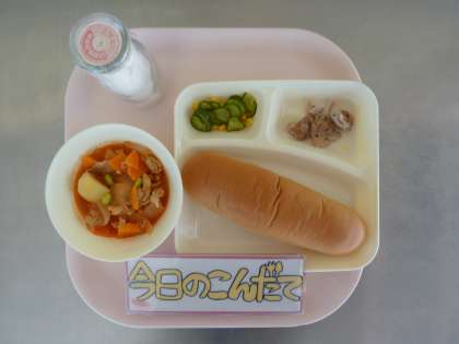 5月23日(月)の献立は「鶏肉のバジル焼き・ケチャップ煮・きゅうりとコーンのサラダ・黒糖パン・牛乳」でした。鶏肉はバジルとオリーブ油の風味がきいた一品でした。ケチャップ味の洋風の煮ものは子どもに人気でした。