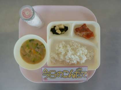 5月24日(火)の献立は「赤魚のしょうゆだれかけ・みそ汁・わかたけ煮・ごはん・牛乳」でした。今が旬のたけのこと生のわかめを炊き合わせたわかたけ煮が出ました。給食では旬の食材を用いた献立が登場します。